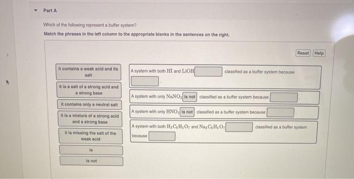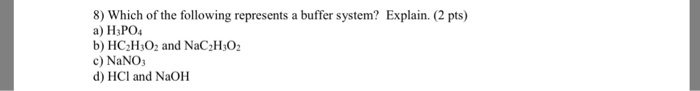 An isolated system is one in which objects inside the system are not influenced by any forces from outside the system. Which of the following represents a buffer system. And the nitrate is also um a week base but weaker. Chemistry questions and answers. Chemistry questions and answers. In order to have a buffer solution we need a weak acid with consequent base. Check all that apply. Explain aH3PO3 bNaNO3 cCH3COOH and NaCH3COO dHCl and NaOH. But its so weak its weaker than water.