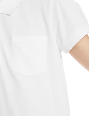 Scallop collar polo shirt. Scallop print short sleeve OoohCotton shirt in lightweight super soft double mercerized stretch cotton with point collar and French placket. Knitted from 100 cotton they provide a smooth and comfortable fit and feel all school day long. Girls White Scallop School Short Sleeve Polo Shirt 2 Pack features in our Polo Shirts collection.